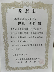 さて、今回は岡山県技士会より表彰状を頂きました!
